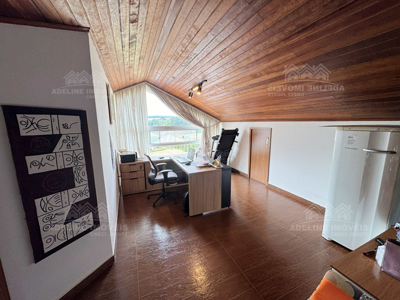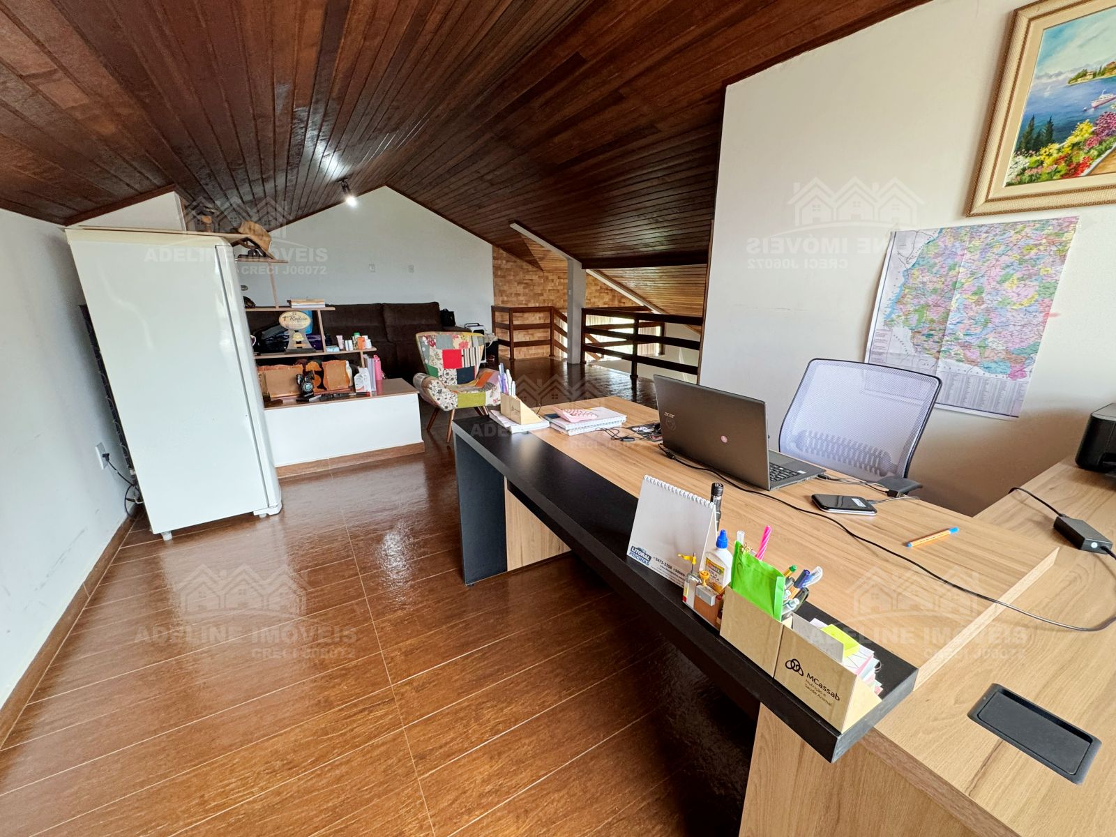 No piso superior, a casa possui um amplo mezanino, que pode ser utilizado como escritório, sala de TV, espaço de trabalho ou até mesmo área de convivência.