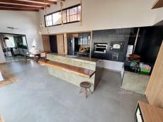 A cozinha possui móveis planejados e excelente espaço de bancada, conectando-se com os demais ambientes da casa.
