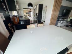 A cozinha possui móveis planejados e excelente espaço de bancada, conectando-se com os demais ambientes da casa.